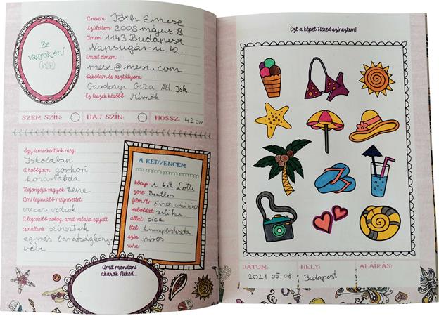 -belül az oldalpár egyik felén az alkotó személy adatait lehet megjeleníteni, a másik oldal pedig változó színezési lehetőséget kínál